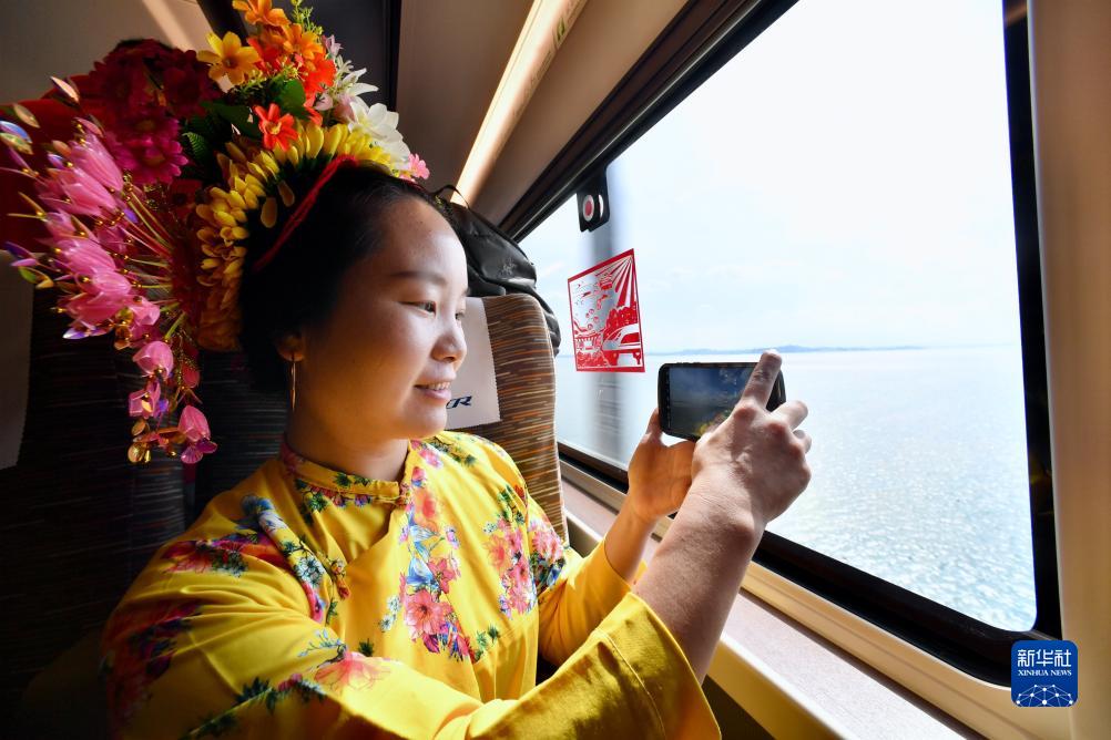9月28日,在福厦高铁首趟复兴号智能动车组G9801次列车上,泉州蟳埔女黄丽泳用手机拍摄窗外景色。