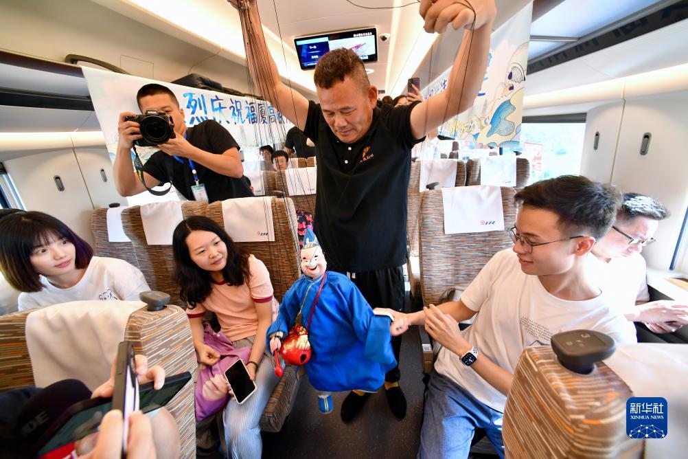 9月28日,在福厦高铁首趟复兴号智能动车组G9801次列车上,木偶表演者在为乘客表演提线木偶。
