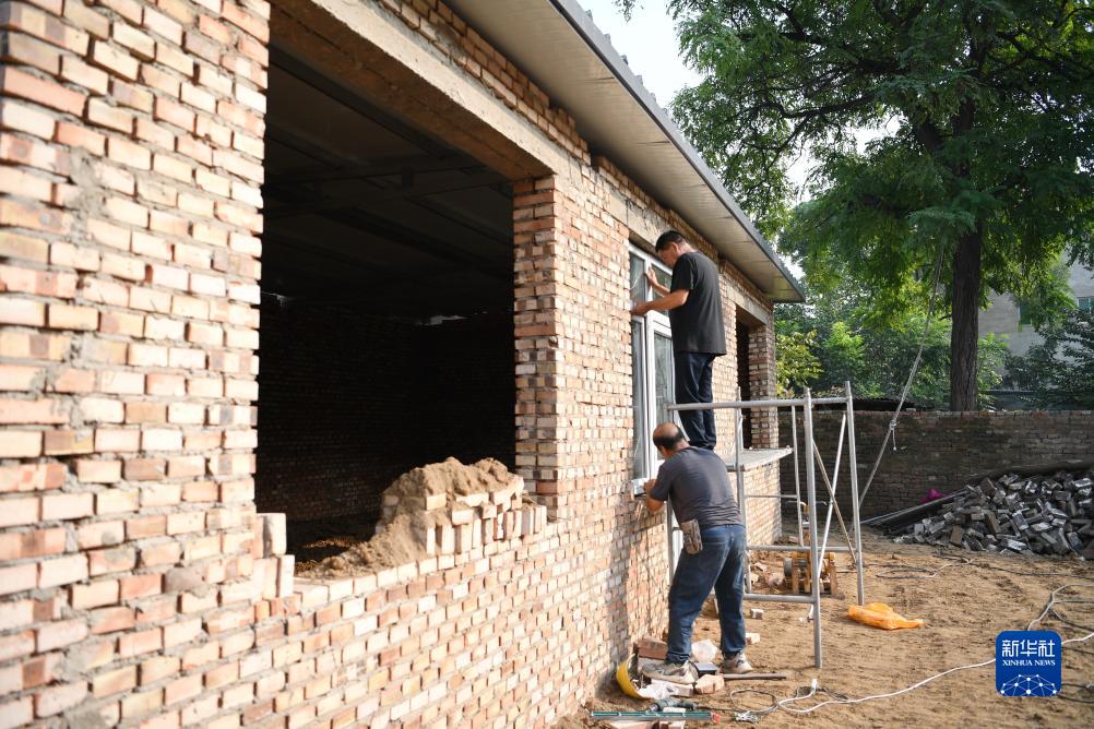 9月26日,工人在河北保定涿州市刁窝镇刁四村一处受损房屋重建现场安装窗户。