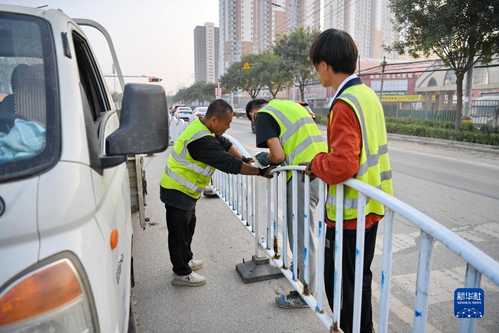 9月26日,在107国道河北保定涿州段,工人在安装护栏。