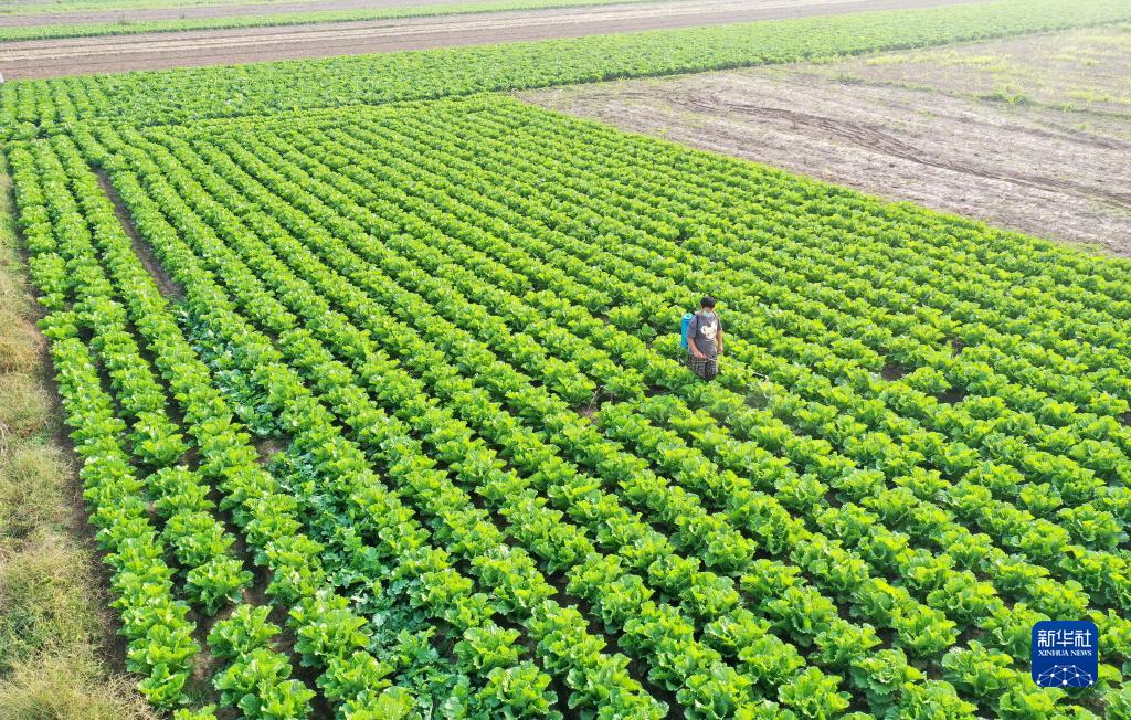 河北保定涿州市刁窝镇潘各庄村农民在补种的白菜地里喷洒农药(9月26日摄,无人机照片)。
