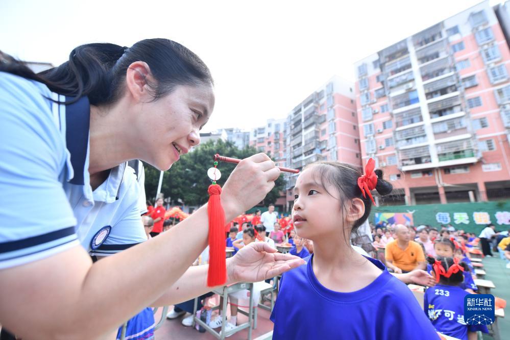 9月28日,梧州市龙圩区龙圩中心小学老师为一年级新生点朱砂启智。