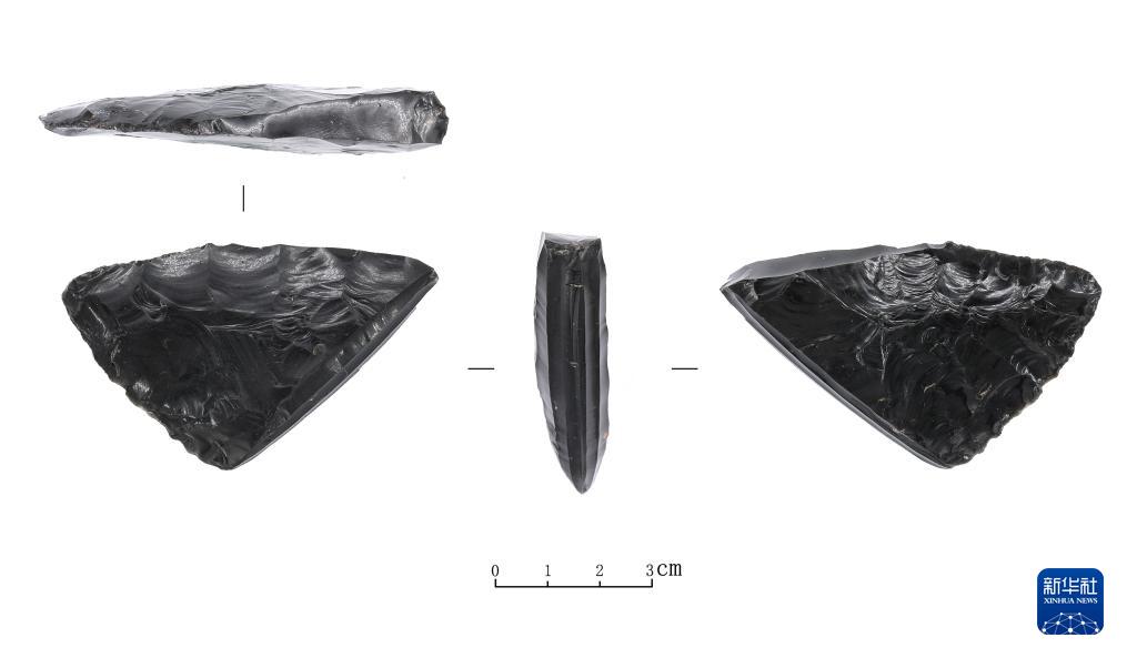 图为和龙大洞遗址出土的细石叶石核。吉林和龙大洞遗址年代距今5—1.5万年,是中国长白山地区年代最早、文化序列最完整的旧石器时代晚期遗址,也是目前东北亚最早利用黑曜岩制作石器的遗址之一,清晰地展示了该地区石器工业由石片石器向“石叶—细石叶”技术转变的重要过程,丰富了东北亚现代人演化扩散、文化发展、生计方式的相关认识。