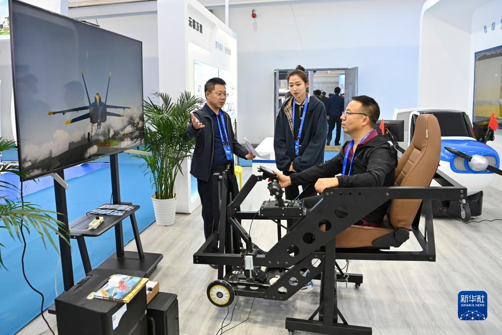 9月28日,参观者在2023太原国际通用航空博览会上体验模拟飞行系统。