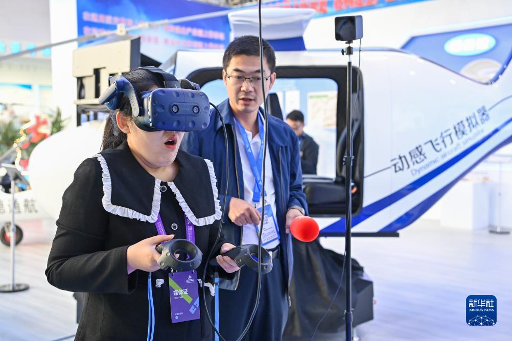 9月28日,一名媒体工作人员在2023太原国际通用航空博览会上体验VR机务教学系统。