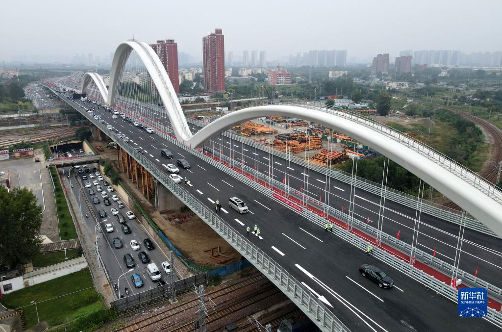 这是9月28日拍摄的通车后的郑州北三环新建彩虹桥(无人机照片)。