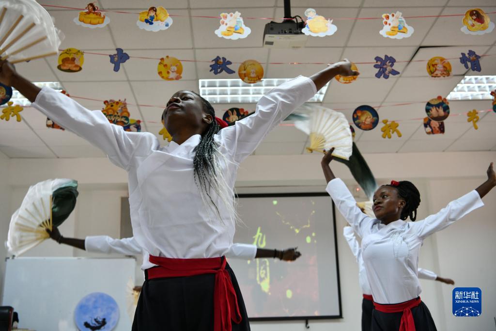 9月28日,肯尼亚学生在内罗毕大学孔子学院举办的“诗剧颂中秋,中肯共月明”中秋庆典活动上表演中国传统舞蹈。