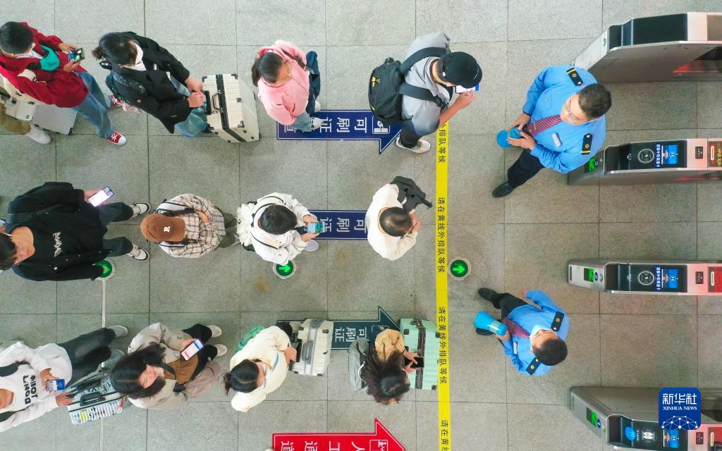 9月28日,在河南省焦作市武陟县高铁站,旅客在闸机门口排队等候检票(无人机照片)。