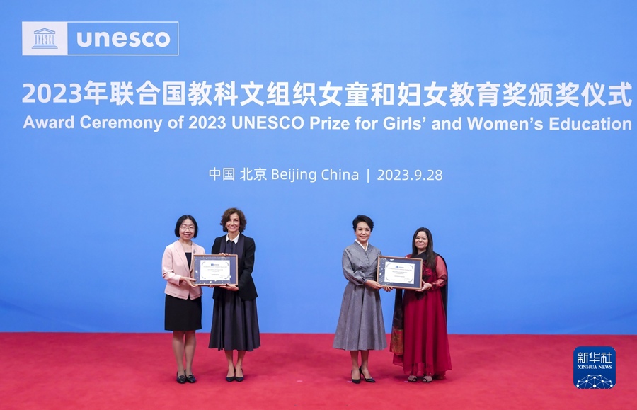 9月28日上午,国家主席习近平夫人、联合国教科文组织促进女童和妇女教育特使彭丽媛在北京同联合国教科文组织总干事阿祖莱共同出席2023年联合国教科文组织女童和妇女教育奖颁奖仪式并分别发表致辞。这是彭丽媛和阿祖莱共同为获奖的中国儿童少年基金会和巴基斯坦女童教育联盟代表颁奖。新华社记者 丁林 摄
