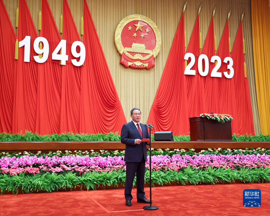 9月28日晚,庆祝中华人民共和国成立74周年招待会在北京人民大会堂举行。中共中央政治局常委、国务院总理李强主持招待会。