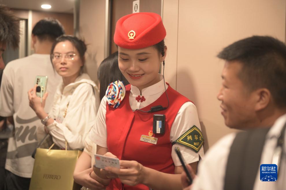 首发车G9801次列车长车艳雪和她的同事登上福厦高铁复兴号智能动车组为乘客服务。“在列车上我们要用心用情做好服务,让乘坐福厦高铁的乘客在旅行中享受到不一样的跨海之旅,展现我们海上‘高姐’的风采。”车艳雪说。