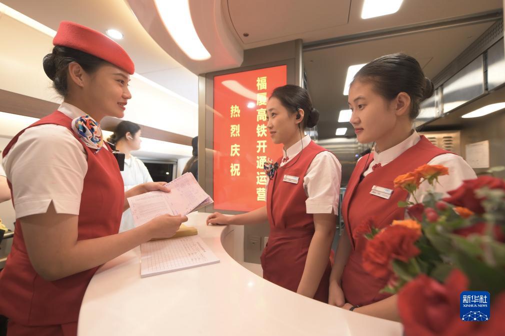 首发车G9801次列车长车艳雪和她的同事登上福厦高铁复兴号智能动车组为乘客服务。“在列车上我们要用心用情做好服务,让乘坐福厦高铁的乘客在旅行中享受到不一样的跨海之旅,展现我们海上‘高姐’的风采。”车艳雪说。