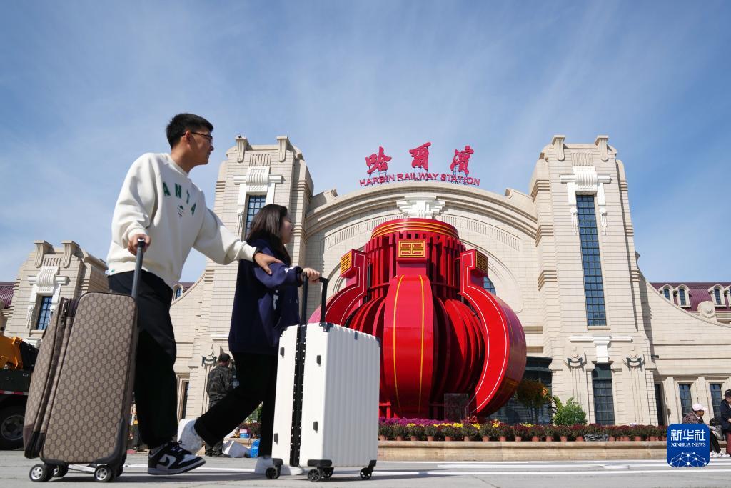 9月29日,旅客从哈尔滨火车站南广场走过。