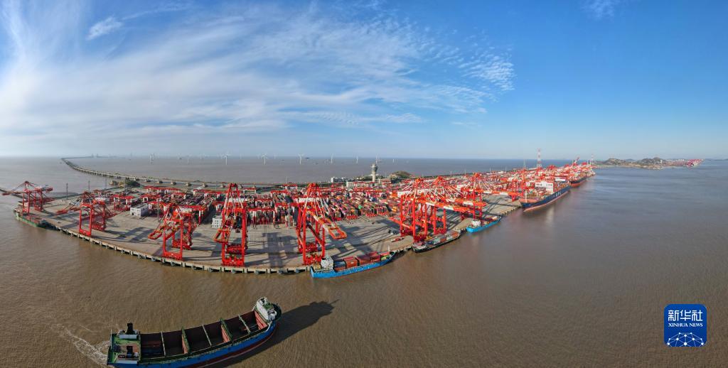 这是中国(上海)自由贸易试验区洋山港四期无人码头(2021年4月6日摄,无人机全景照片)。