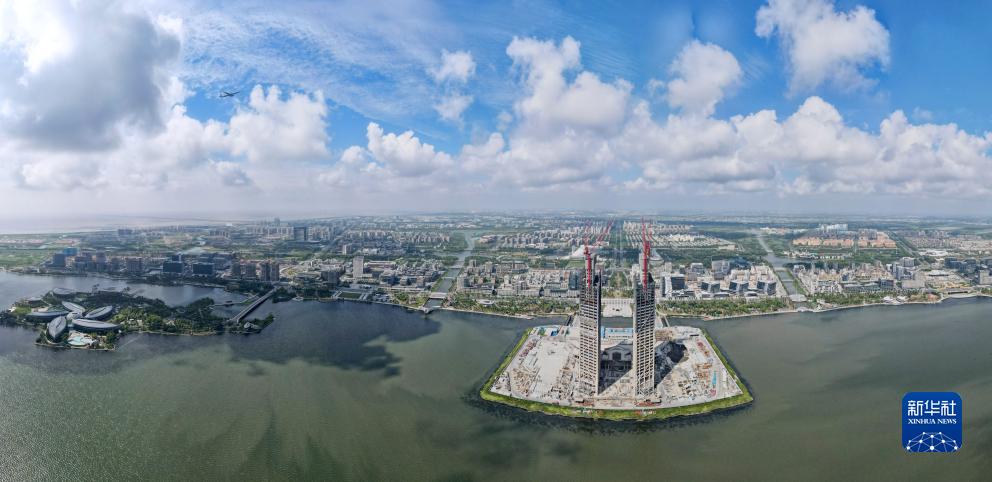 这是中国(上海)自由贸易试验区临港新片区,左上为东海大桥,前为建设中的中银金融中心大楼(2023年9月6日摄,无人机全景照片)。