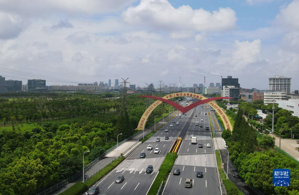 这是位于上海外高桥保税区的中国(上海)自由贸易试验区的标志“海鸥门”(2023年8月1日摄,无人机照片)。