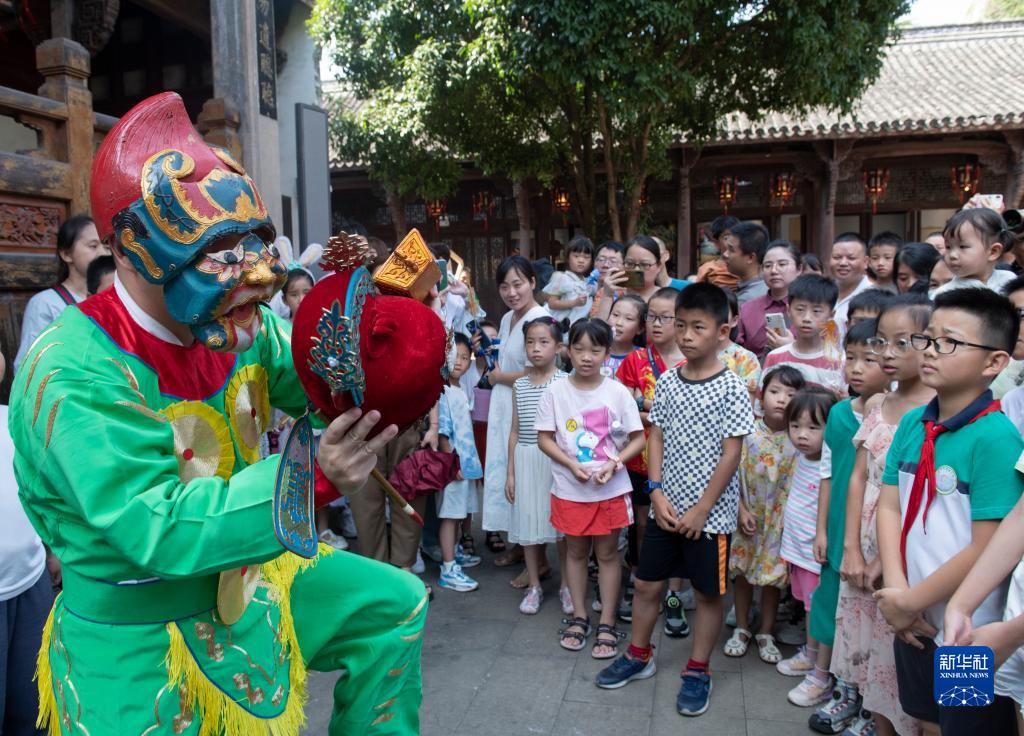 9月29日,在浙江省金华市非遗馆,浙江婺剧艺术研究院演员在表演婺剧片段《点魁星》。