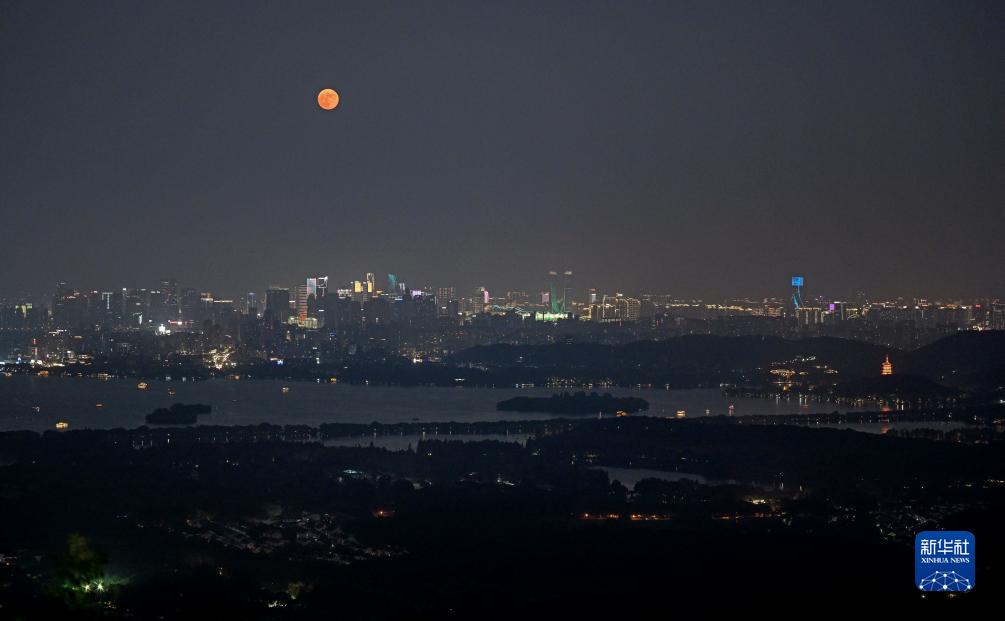 中秋佳节当晚,一轮满月高悬在杭州上空,吸引众多市民游客观赏。
