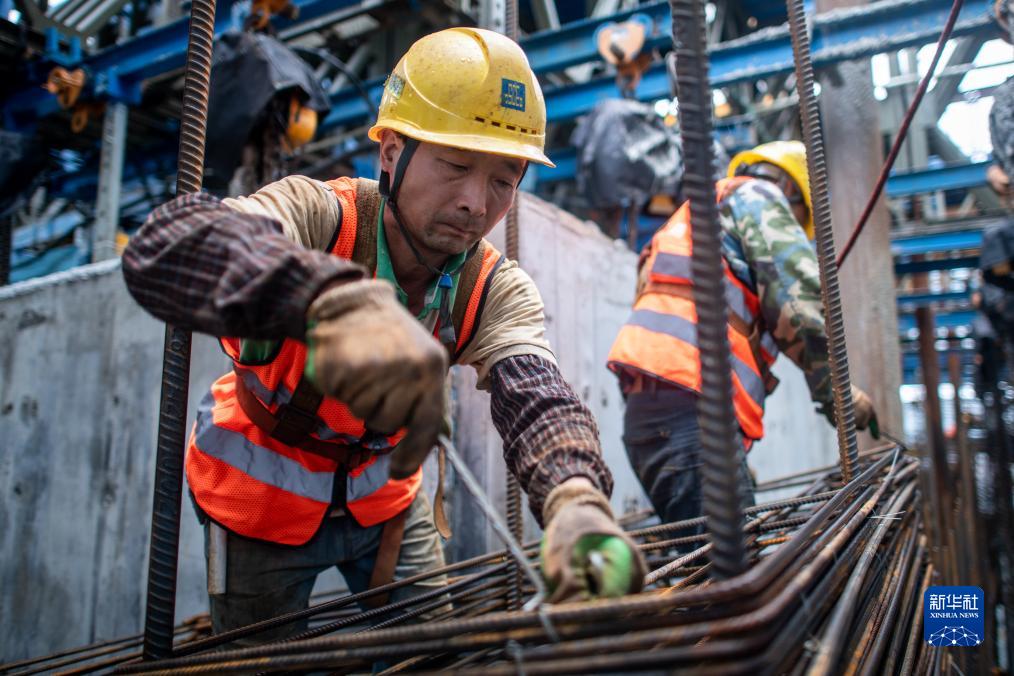9月30日,在湖北省武汉长江中心项目工地,中建三局工人在空中造楼机内进行钢筋绑扎作业。