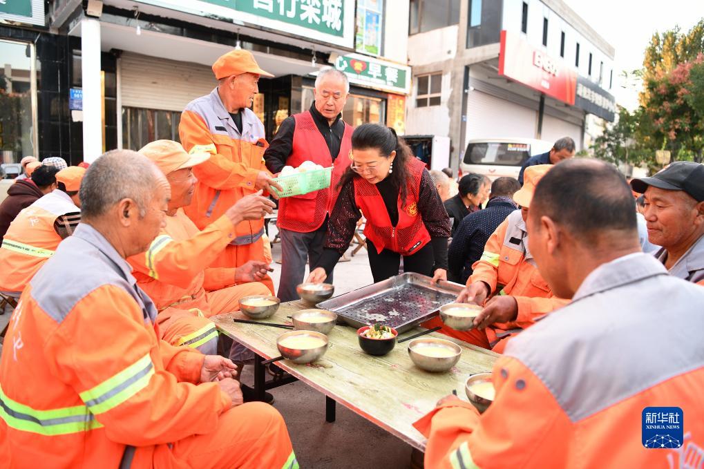 9月30日,在河北省石家庄市栾城区爱心早餐店,志愿者在为环卫工人上早餐。