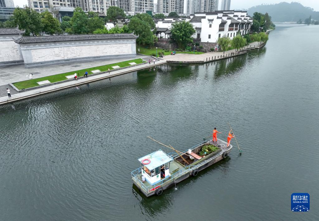 9月30日,在安徽省黄山市屯溪区,保洁员在新安江江面上打捞漂浮物(无人机照片) 。