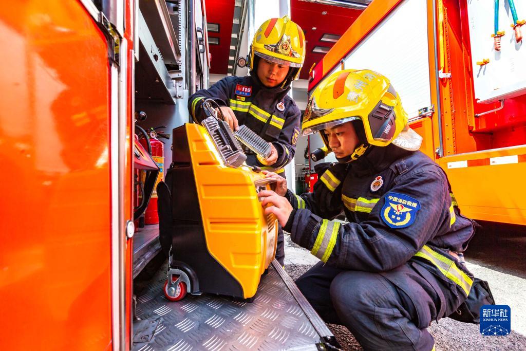 9月30日,消防救援人员在贵州省安顺经济技术开发区消防救援大队检查装备。