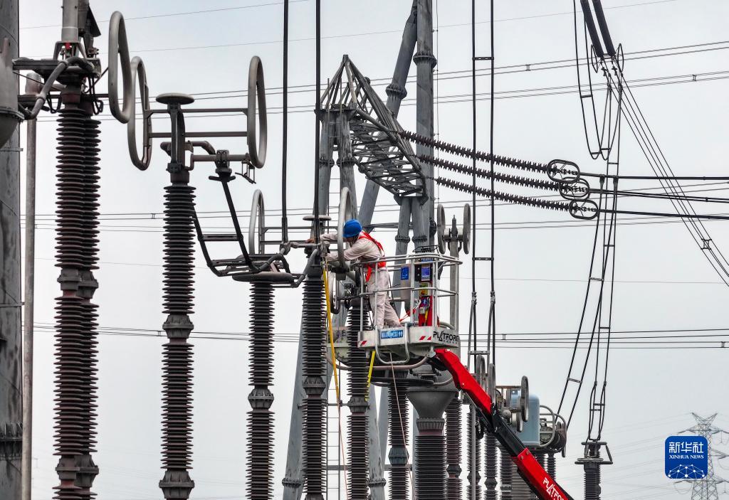 9月30日,电力人员在江苏省泰州市500千伏泰兴变电站检修现场对设备进行检修作业(无人机照片)。