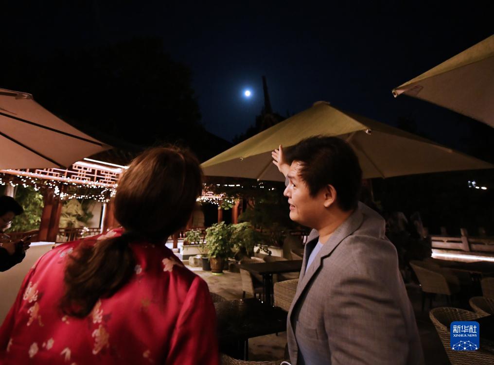 9月29日,人们在德国汉堡的豫园内欣赏中秋满月。