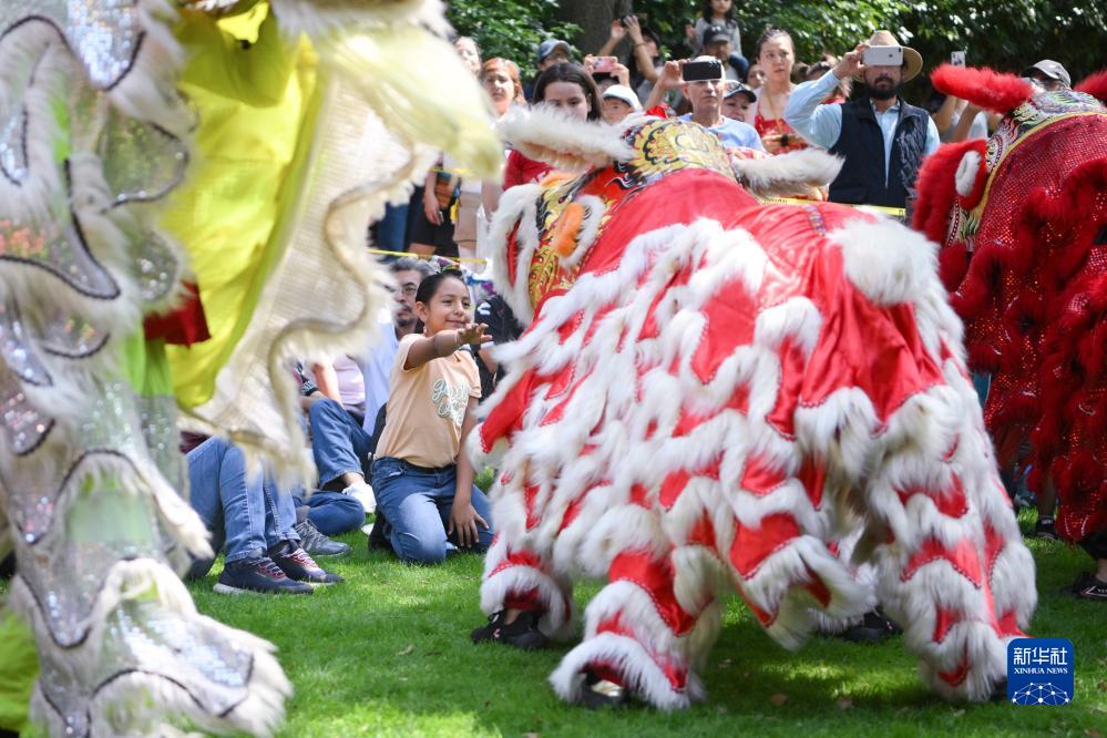 9月29日,在墨西哥首都墨西哥城,一名儿童在中秋文化活动中与舞狮表演者互动。