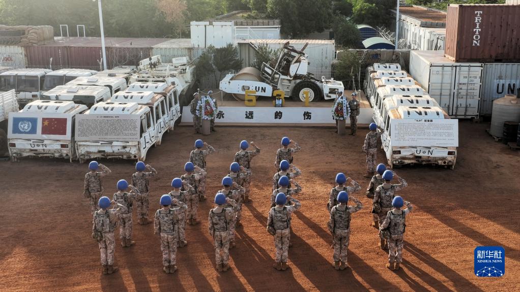 中国第10批赴马里维和工兵分队官兵在“5·31烈士纪念园”举行祭奠英烈仪式,缅怀申亮亮烈士(当地时间9月29日摄)。