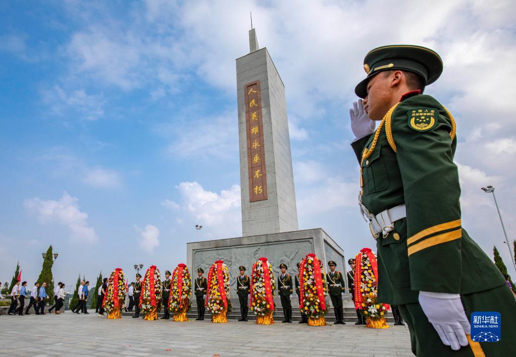 9月30日,武警广西总队贺州支队官兵在贺州市古柏山烈士陵园参加烈士公祭活动。
