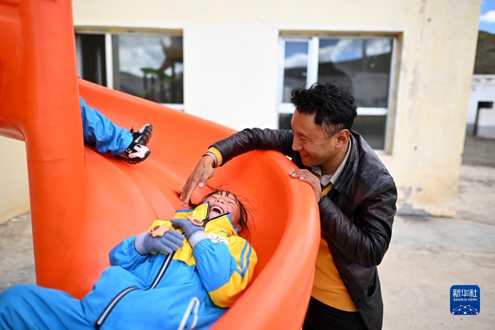 9月13日,青海省玉树藏族自治州曲麻莱县秋智乡幼儿园园长罗松义西在校园内和小朋友一起玩耍。