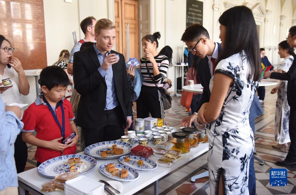 9月30日,在奥地利格拉茨大学活动现场,人们品尝中国茶和月饼。