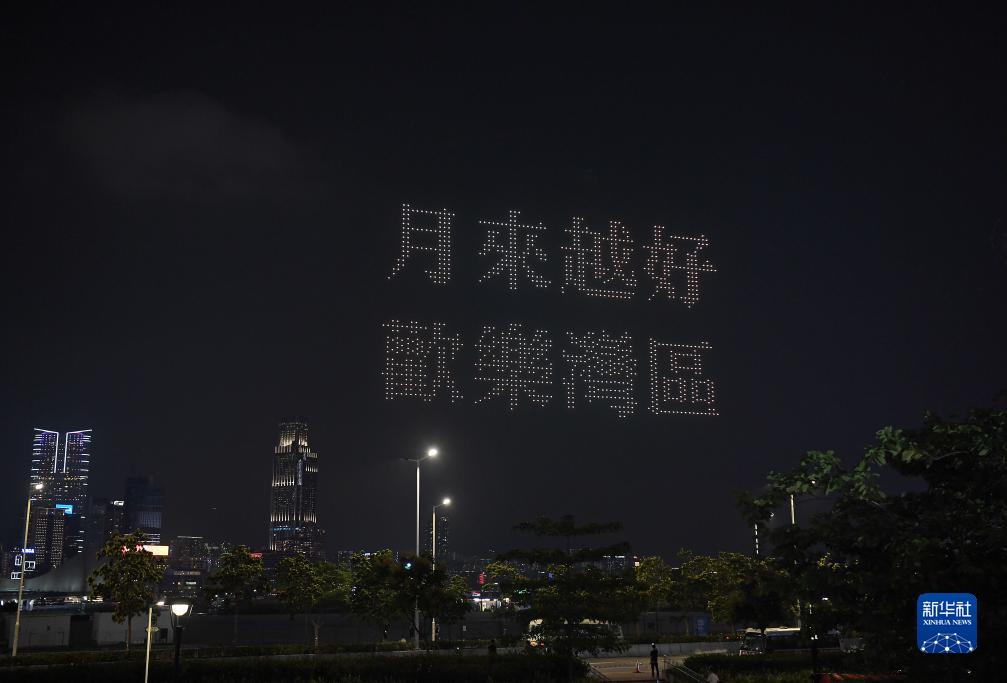 9月30日,无人机在维港上空拼成“月来越好 欢乐湾区”字样。