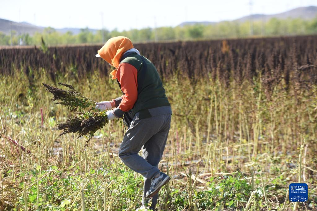 10月1日,在沽源县白土窑乡小西沟村,种植户王秀梅在田间捡拾收割机收割后剩余的藜麦。