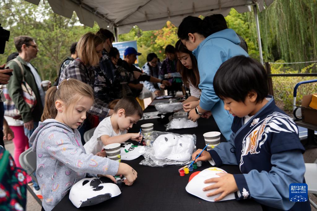 9月30日,在美国华盛顿史密森学会国家动物园,小朋友们制作大熊猫主题面具。