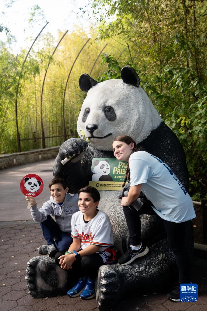 9月30日,在美国华盛顿史密森学会国家动物园,游客与大熊猫雕塑合影。
