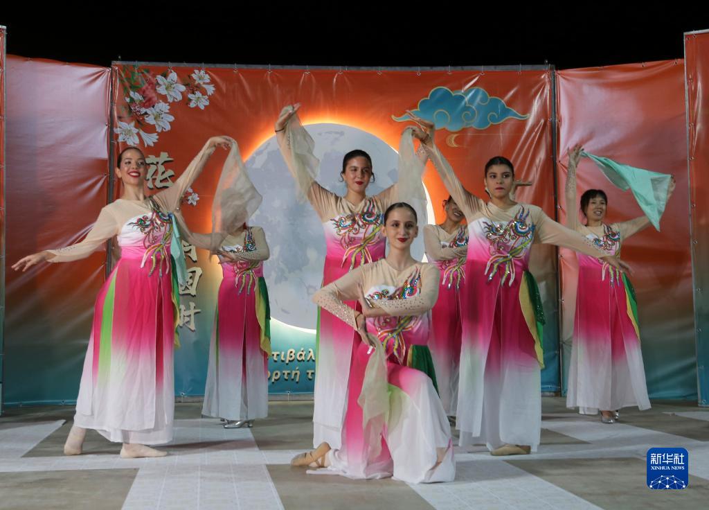9月29日,在塞浦路斯利马索尔大区帕罗蒂亚区政府广场,演员们在“花好月圆时,中塞一家亲”中秋晚会上表演舞蹈。