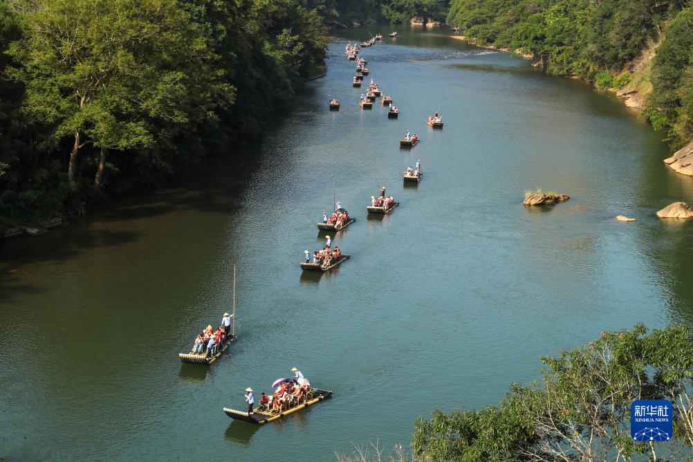 10月1日,游人乘坐竹筏欣赏武夷山国家公园九曲溪两岸风景。