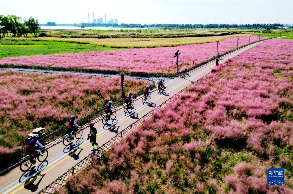 10月1日,骑行爱好者在山东省东营市东营区耿井湿地粉黛乱子草区骑行,欣赏湿地风光。