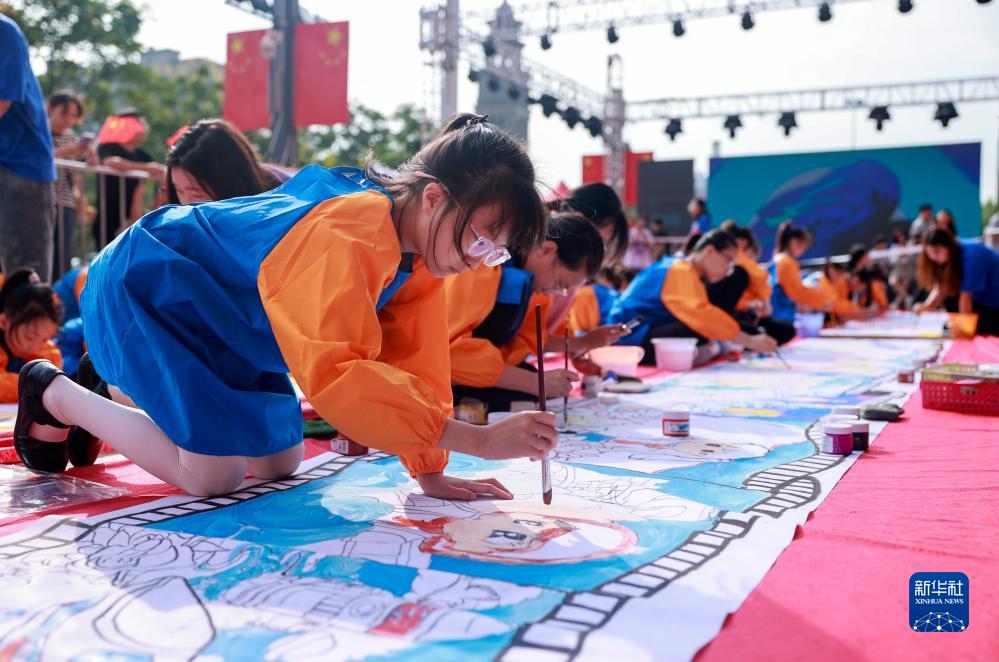 10月1日,在江苏省泰兴市万达广场,百名儿童在百米长卷上作画。