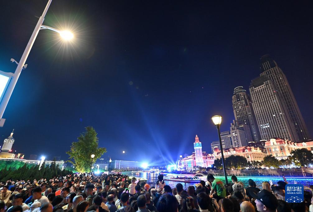 10月1日,游人在天津市海河两岸观看灯光秀。