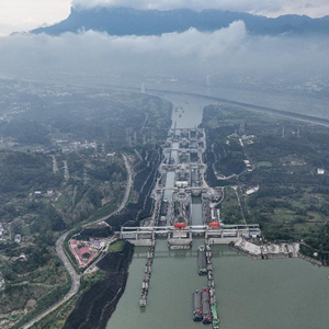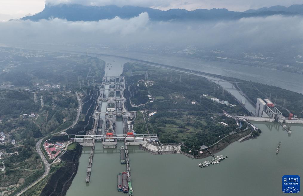 10月1日,船舶有序通过三峡双线五级船闸和升船机(无人机照片)。