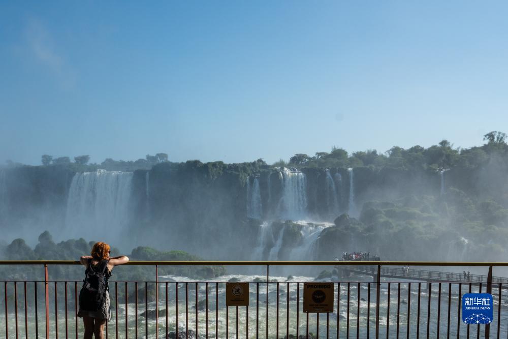 10月1日,游客在巴西巴拉那州伊瓜苏大瀑布景区内参观。