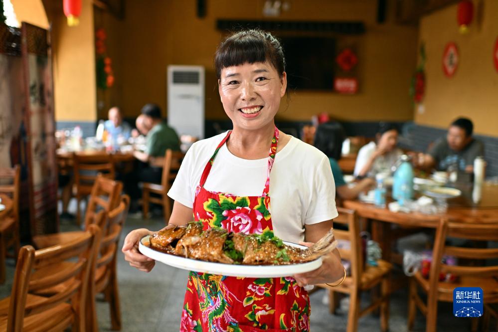 在山西碛口古镇,村民贾娟展示自家饭店的菜品(8月2日摄)。贾娟原来是碛口古镇的导游,2011年开始经营饭店。随着来碛口古镇旅游的客人逐年增加,贾娟的饭店生意也越来越好。