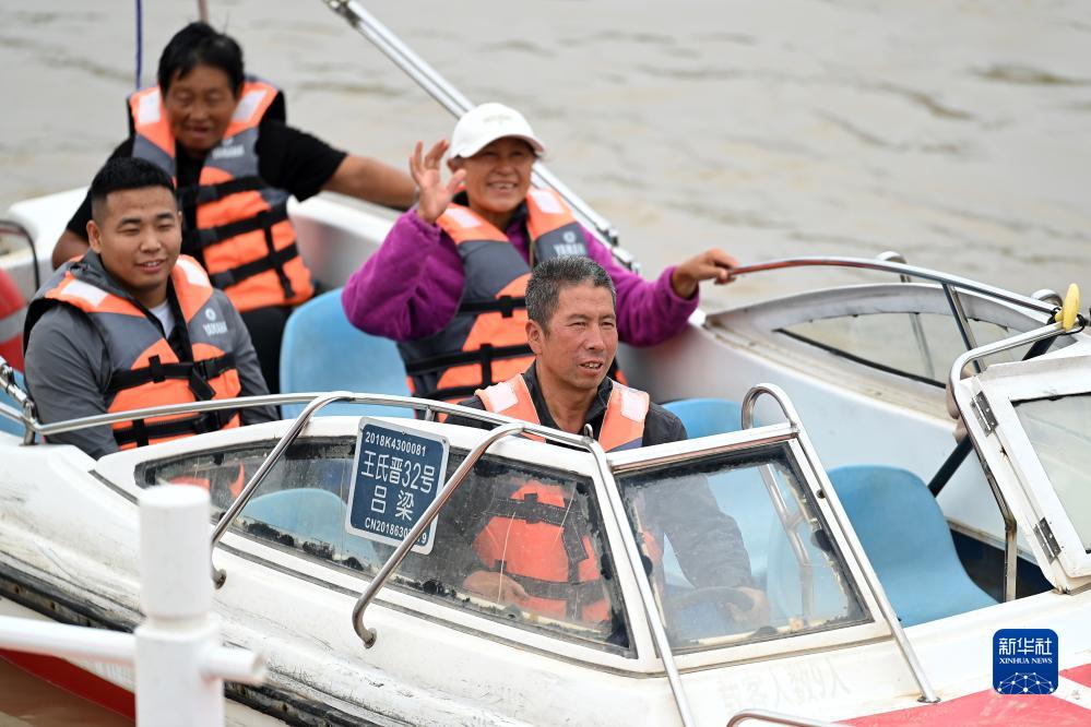 在山西碛口古镇,村民张保生(前)驾驶快艇在黄河上行驶(9月26日摄)。张保生以前以摆渡为生,开的是木船和铁船,2000年考了快艇驾驶证。如今,他农忙时种地,农闲时开快艇带着游客在黄河上观光,一年能收入3万多元。