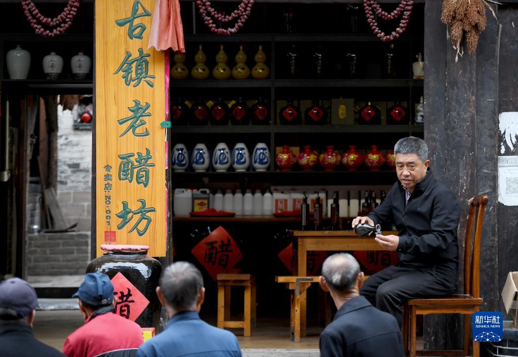 在山西碛口古镇,张海龙邀请游客品尝陈醋(9月26日摄)。张海龙之前是卡车司机,2018年,他在碛口古镇开了一家山西陈醋店,吸引不少游客光顾。