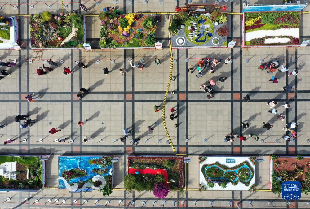 10月2日,市民和游客在石家庄市首届园林“微景观”制作大赛成果展上参观(无人机照片)。