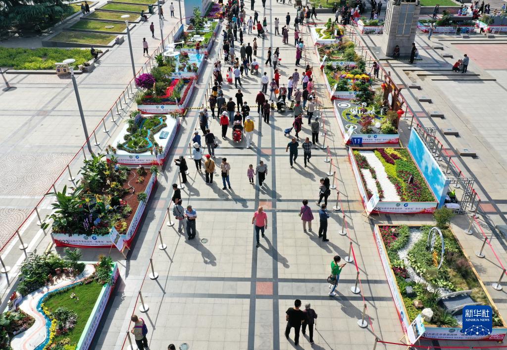 10月2日,市民和游客在石家庄市首届园林“微景观”制作大赛成果展上参观(无人机照片)。