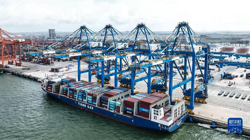 10月2日,一艘海轮停靠钦州港自动化码头卸货(无人机照片)。